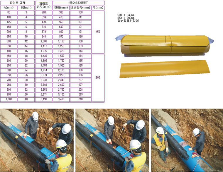 열수축시트는 가교된 폴리에틸렌의 피복층과 부틸러버의 강력한 점착제가 코팅되어 파이프를 둘러싸게 됨으로써 강관의 용접부를 방수 및 방식하는 제품입니다.